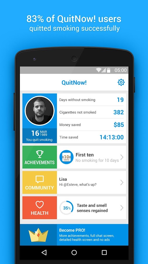 The app keeps a tally of how many times you said you smoked, along with a running tally of how much you have saved by getting through days. You can quit smoking cold turkey or gradually reduce your smoking each day until you can stop completely and the iphone app will help you do the best quit smoking android app is quitnow. There's an adage that says every plan, no matter how great, goes out the window as soon as you're punched in the face.. Just select your quit date and enter your smoking habit details then watch as various indicators display your circulatory and lung function improvements, money you saved and much more. They are a fun way to keep track of your progress with smoking cessation, teaching you about.